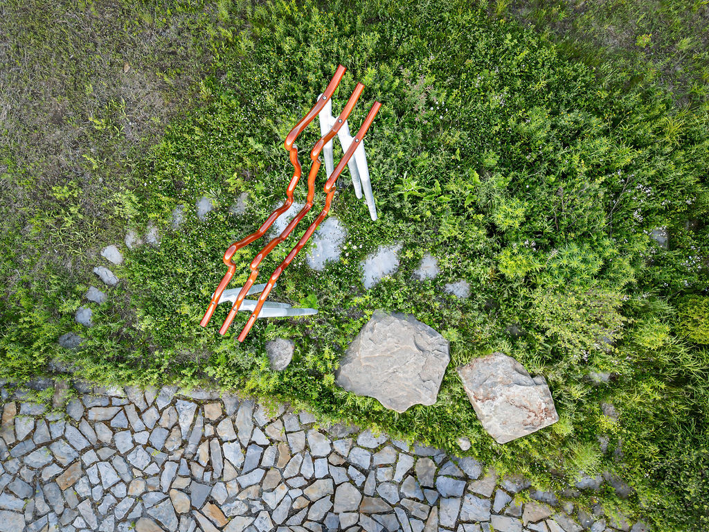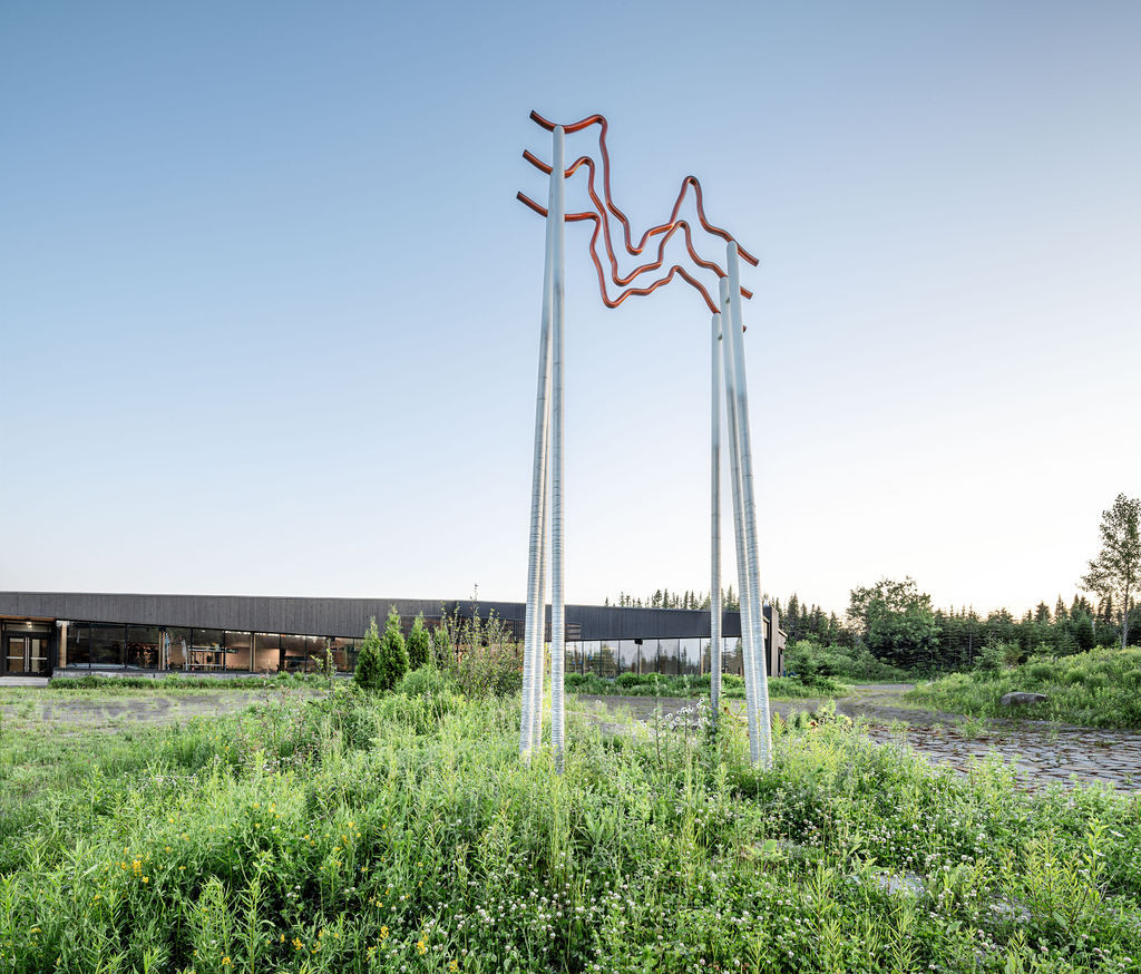 L’œuvre exprime la majestuosité des Laurentides dont les reliefs géologiques ont été sculptés par le passage des glaciers, au fil de milliers d’années. Les formes de dénivelés ou de courbes topographiques déposées au sommet de fins piliers verticaux invitent à entrer dans le paysage. L’œuvre symbolise le sensible va-et-vient entre les échelles macroscopique et microscopique ressenti par les visiteurs. Autant de perspectives historiques, sensorielles, psychiques possibles pour aborder ce riche et vaste paysage boréal.