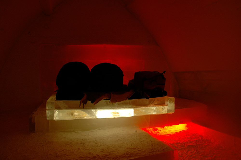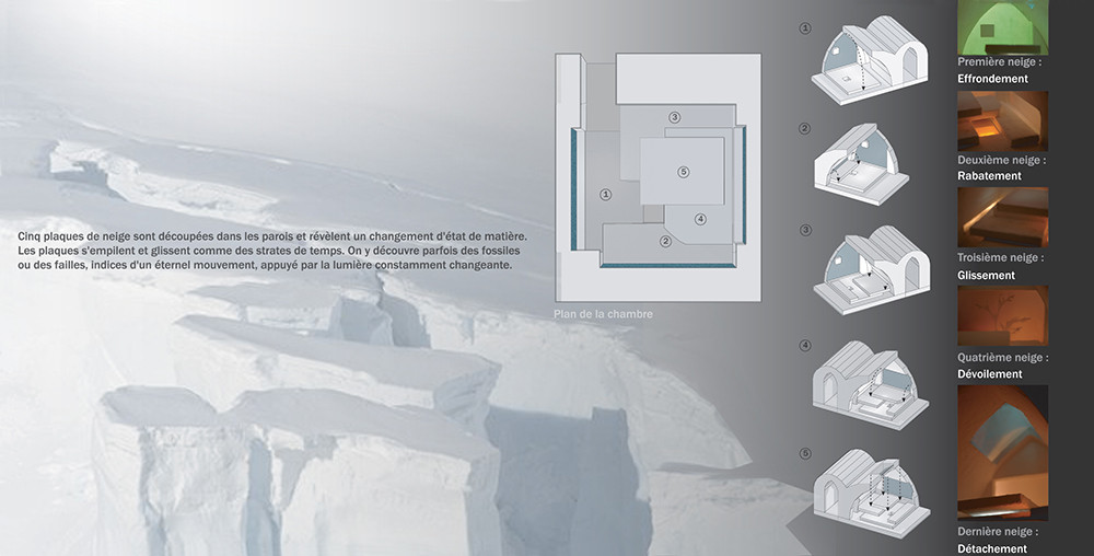 Cinq plaques de neige sont découpées dans la paroi et révèlent un changement d'état de matière. Tombées, rabattues, glissées, les plaques s'empilent comme des strates de temps. On y découvre des failles, indices d'un éternel mouvement appuyé par la lumière constamment changeante.
